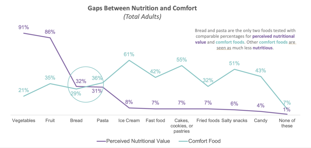 Stacey Krawczyk: Food is more than nutrients. It is our culture and our memories – these drive the aspects of “comfort” and familiarity. Food, however, cannot support nutrition if it is not eaten. This is where we seek to make choices that offer a balance of taste and nutrition or balance out choices over the course of the day. So as our survey shows, Americans enjoy foods that they perceive as very comforting but lacking in nutrition, such as ice cream, as well as those that they perceive as very nutritious but not so comforting, such as fruits and vegetables. But most interestingly, it shows that a good portion of consumers perceives grain foods as the one food type that provides the best balance of both comfort and nutrition. So it’s easy to imagine many Americans enjoying an array of grain foods as choices that help them strike the comfort-nutrition balance, from indulging in high-comfort Nutella on a piece of high-nutrition whole-grain toast for a snack, to getting your kids to each more high-nutrition vegetables by serving them alongside high-comfort macaroni and cheese.