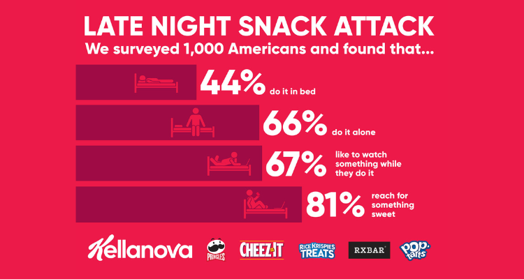 2024 Late-Night Snacking survey, by Kellanova (formerly Kellogg Company), has shown that bedtime isn’t just for sleep in America. In a survey of more than 1,000 U.S. adults conducted to better understand Americans’ late-night snacking preferences, nearly 44% of the people who snack late at night do so while in bed – with 58% of adults ages 18-24 noting this is their location of choice for late-night snacks. The survey also found that late night nibblers favor cookies, ice creams and chips.