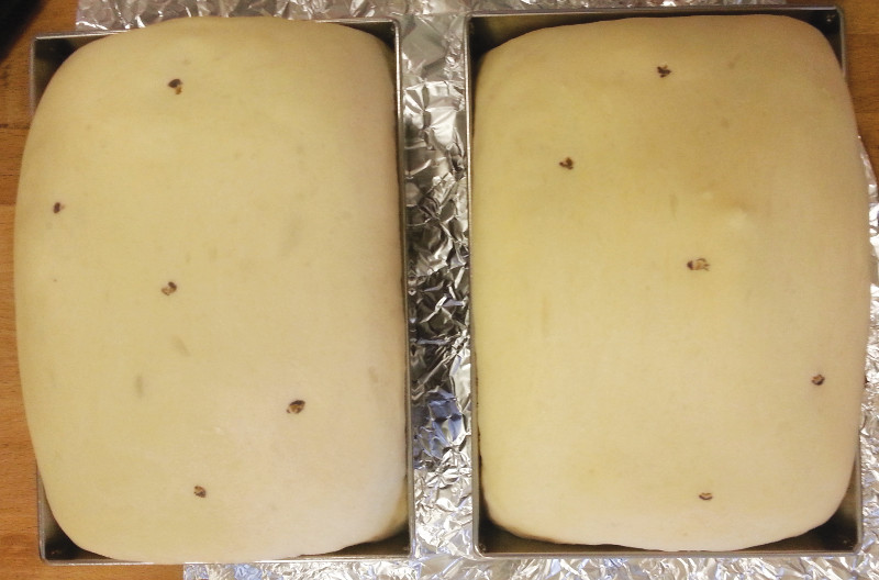 The “no time dough“ was split by hand into four dough pieces of 400 g, rounded into cylindrical bread loaf shapes and put into baking pans. All doughs were proofed for 1 h at 44 °C (112 °F) and spiked with the Salmonella solution using a Hamilton syringe. Figure 1 shows the proofed spiked dough from “no time dough”, after proofing for 60 minutes at 44 °C (112 °F). The dough pieces of 400 g were inoculated with 5 x 0.2 ml Salmonella solution (c= 5,000 CFU/ml) at five different positions from the top – once in the center and four times at a 3-cm distance to the baking pan wall. The spiked sponge (70 % of total flour) was inoculated with 1 ml of Salmonella solution (3.100 CFU/ml) and then proofed for three hours at 30 °C (86 °F), mixed with the residual flour, split into four loaves as before and finally proofed for another hour at 44 °C (112 °F). During the four hours of proofing, growth of the injected Salmonella was estimated. From experience, the final CFU concentration in the dough was assumed to go up to ~8.500 CFU per 400g of dough.