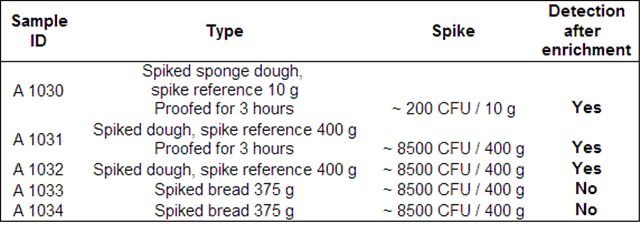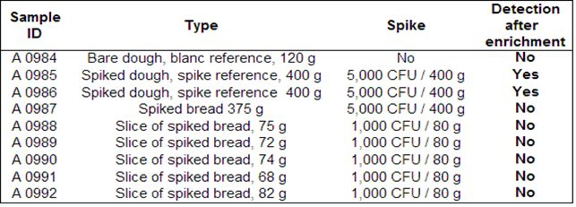 After cooling down, one bread (“no time dough”) was packed as a whole (375 g), whereas the other bread was sliced into five slices of about 74 g (+/- 7 g) and then packed, each slice separately, into sterile bags (whirl-Paks) for dissolving, enrichment and analysis according to the technical instructions of the detection test. The two breads (“sponge & dough”) were packed as a whole (375 g) into sterile bags.