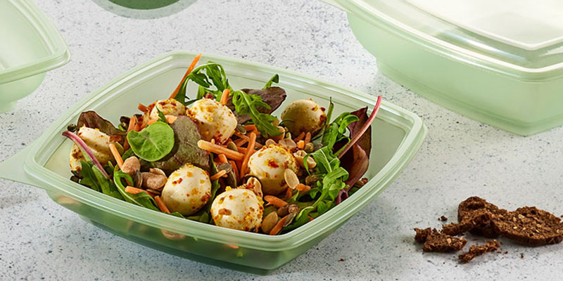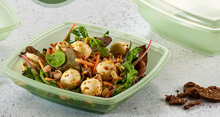 The Plaza range provides a stylish and practical serving solution for salads and pastas. The bowls are designed to enhance on-shelf presentation and appeal and are available in a wide range of sizes, which can be stacked for space-efficient storage. The Evolve by Faerch Plaza bowls vary in color, reflecting the recycled material they are made from. This effectively communicates the sustainable nature of the bowls to the end-consumer. This attracts attention and impacts buying decisions.