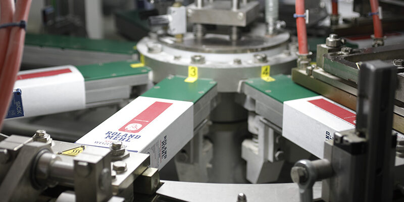 For Roland Mills United, it was clear from the very beginning that the products’ secondary packaging had to match the primary packaging in quality. “We want to offer our dust-tight flour bags in premium retail, which is why we invested in a Syntegon case packer that packages them in a sustainable display carton. This allows us to achieve a high-quality look that attracts the consumers’ attention at the point of sale and highlights our brands,” explains Karrenbauer. The Elematic 3001 WAH from Syntegon packs 100 flour packs per minute – and is particularly sustainable thanks to minimal use of adhesives. When folding the display cartons, the adhesive is only applied selectively so that the secondary packaging can easily be disposed of in the paper waste.