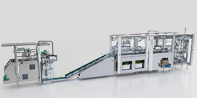 Syntegon’s new line is positioned as a response to these constraints, integrating bagging and case packing into a single system designed to optimize throughput and reduce inefficiencies associated with fragmented equipment setups. The SVX Agile forms, fills and seals pillow bags, which are then transferred directly to the Elematic 4001 for automated case loading.