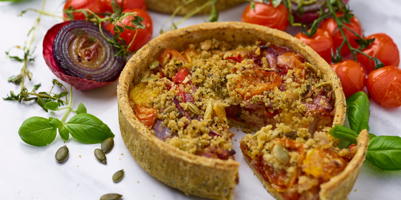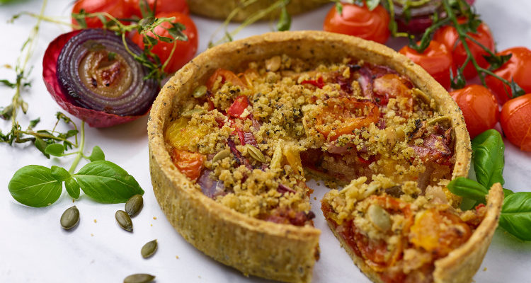 The Menuserve Mediterranean Vegetable Tart is a ready-to-bake, crisp basil pastry case filled with a slow-roasted tomato sauce topped with grilled courgettes, red and yellow peppers, red onions and cherry tomatoes, all finished with a crunchy basil and pumpkin seed crumb.