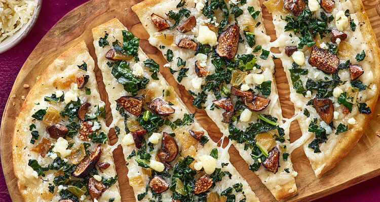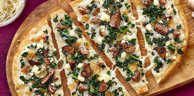 • Mushroom, Caramelized Onion & Fig — Savory, meet sweet. Hearty, rich mushrooms and caramelized onions plus sweet fig and kale are a match made in heaven. Topped with a creamy garlic sauce and Daiya’s much-loved mozza and feta-style cheeze.