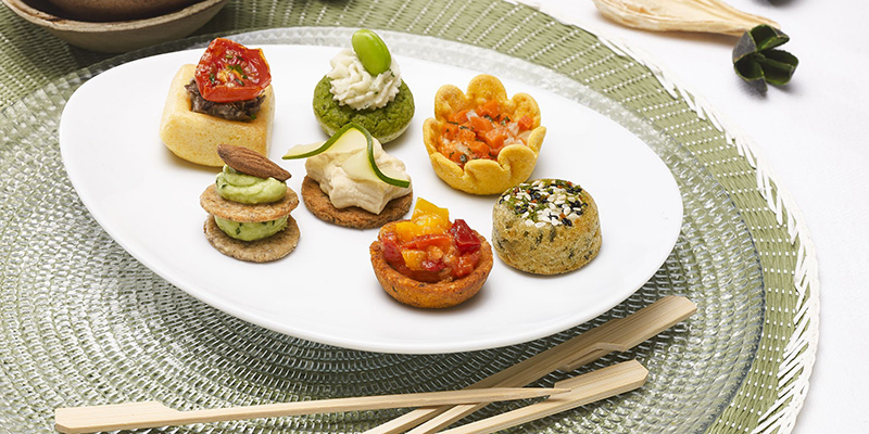 The finger food assortment includes almond cream and edamame bean on pea and mint muffins, carrot, lemon and ginger mousseline mini tarts, sesame hummus and courgette tagliatelle on courgette and pine nut shortbread, sun-dried cherry tomato and olive tapenade on curry polenta cubes, guacamole and almond on walnut crackers, piquillo and sweet pepper tomato tarts, and falafel bites topped with sesame seeds.